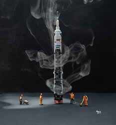 The evening concluded with members setting up cardboard triangles with black or white paper sheets attached to make instant scene backcloths. They could then create small worlds using the vast array of props and mini people that Mark had brought along. For an hour or so removed from reality, Daleks could confront dinosaurs, posable art dolls push supermarket trolleys, engineers mend a broken down van, technicians construct circuit boards and spacemen board an electric toothbrush rocket.