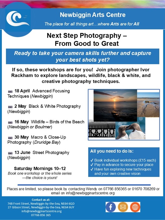 Wendy Storey from Newbiggin Arts Centre has shared the following information about a series of upcoming photography workshops that may be of interest to club members.