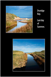 and calm seas, skeletal trees, the Couple at Newbiggen, cloudy and blue skies, vibrant abstract patterns, elements